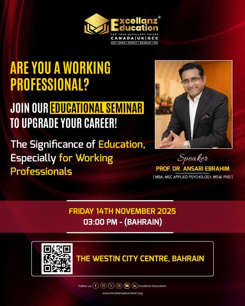News Excellanz Education Kuwait Branch Grand Opening ✅ Inauguration By: Mr. Muhamed Sadath (Managing Director, Gulf Line Trading WLL, Kuwait) Date: 20th November 2025 Time: 6:00 PM Venue: Suite No: 11, Floor 5, Burj Al Tuijar, 13 Abdulaziz Hamad Al Saqer St, Mirqab, Kuwait City Are you a working professional looking to upgrade your career? Join Our upcoming Educational Seminar! Topic: The Significance of Education, Especially for Working Professionals Date: Friday, 14th November 2025 Time: 3:00 PM (Bahrain) Venue: The Westin City Centre, Bahrain Speaker: Prof. Dr. Ansari Ebrahim – CEO & Founder, Excellanz Education